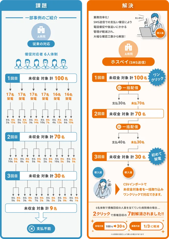 従来の病院における未収金の回収方法は、患者宛に請求書を郵送し、その後電話などで督促、それでも支払いの意思がない場合は提携の法律事務所へ委託をすることが多いと聞いております。