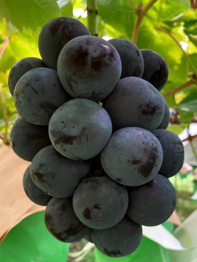 大粒でコクある濃厚な甘さが最大の特徴です。果汁も多くジューシーな品種で、光沢のある黒色でとても美しいぶどうです。平均糖度18度。