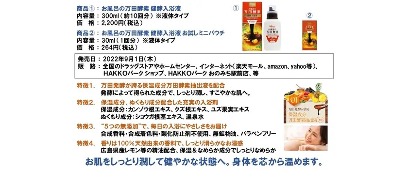 植物発酵食品「万田酵素」を製造・販売する万田発酵株式会社(本社:広島県、代表:松浦 良紀)と、スキンケア・ボディケア・ヘアケア製品の化粧品製造を行う株式会社マックス(本社:大阪府、代表:大野 範子)は、コロナ禍の巣ごもり需要をキッカケとして急拡大した入浴剤市場へ、これまで市場に無かった新しい付加価値となる万田酵素抽出液を配合した新商品「お風呂の万田酵素 健酵入浴液」を異業種コラボで開発し、2022年9月1日(木)から、全国のドラッグストアやホームセンター、インターネット等で発売することを発表します。
