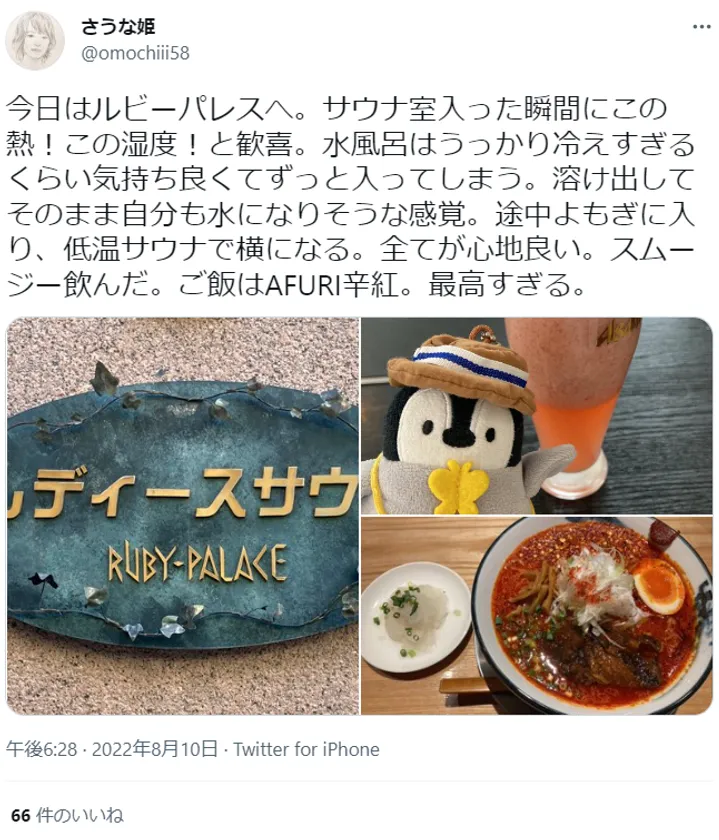 「サウナ女子」として、各種メディアでサウナの魅力を発信するさうな姫氏(@omochiii58)は、自身のTwitter投稿で、度々、女性専用サウナ「ルビーパレス」を取り上げています。同施設では、よもぎスチームサウナやアカスリ、エステなどが楽しめます。このように「サウナ女子」のインフルエンサーも誕生し、女性のサウナブームを牽引しています。一方で、魅力的なサウナ施設は男性専用であるところも多く、レディースデーの設定だけではなく、女性が日常的に利用できるサウナ施設の数が増えていくことが「サウナ女子」ブームを更に高めるには重要かもしれません。