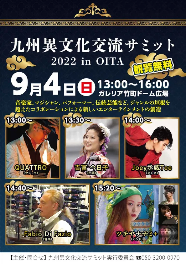 九州異文化交流サミット実行委員会(所在地:大分県大分市、代表:朝見剛士)は、大分を拠点に芸能・文化・町おこし振興や異文化コミュニケーションの促進を目的に「九州異文化交流サミット2022 in OITA」を大分の中心部であるガレリア竹町ドーム広場で2022年9月4日(日)に開催します。