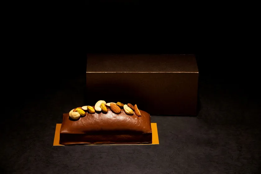 甘さ控えめで、しっとりとした口ざわりの特製ケーキ生地と、チョコレートの香りとやさしい甘さと、ナッツの食感が特徴です。アーモンドやピスタチオ、カシューナッツがトッピングされた、まさに秋におすすめのスイーツです。