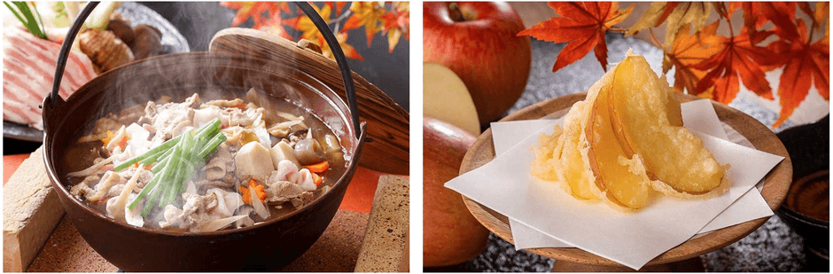 左:信州産のきのこをたっぷり使った鍋。きのこから出る旨味がたっぷりでお腹の底から温まるメニューは、「山あいの秋」を感じさせる見た目にもほっこり癒されます。
