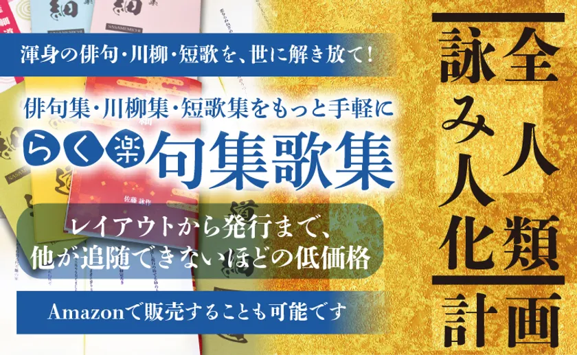 自費出版サービスを提供する、らく楽自費出版工房(所在地:大阪市都島区、代表取締役:石田 秀樹)は、昨今の俳句・短歌ブームの中で令和の詠み人を応援する「全人類詠み人化計画」として、誰でも簡単に俳句・川柳・短歌を安価に出版できるサービス「らく楽句集歌集」の提供を開始しました。