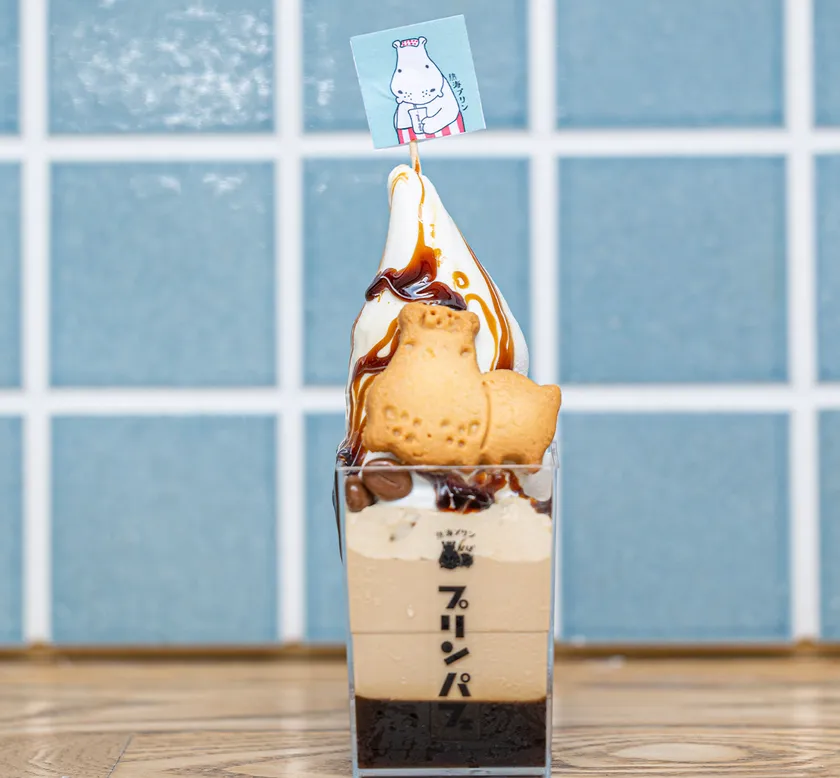 コーヒーゼリーにコーヒープリン、コーヒークリーム、そしてミルクソフトとかばクッキーをトッピング。ほろ苦さとコクのあるまろやかな味わいがマッチするコラボ限定パフェです。