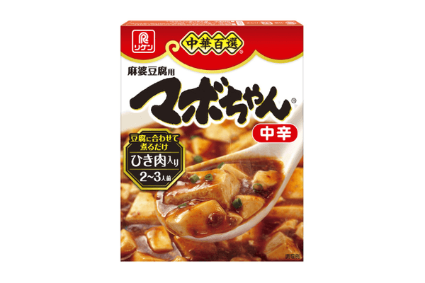 『マボちゃん中辛』は、豆鼓のコクと豆板醤の辛みにポークエキスでコクと厚みを加えた、2~3人前の中辛麻婆豆腐の素。ひき肉入りなので、豆腐だけで簡単に調理できます。