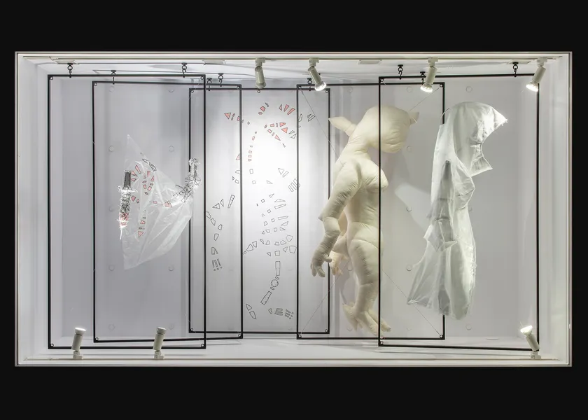 衣服を着る私たちは世界そのもの。フレームを解体した、未知の骨組みを包む入れ物(生物)はフレームの入れ物でもあり、フレームを包んでいる空間全体と言え、世界の入れ物に他なりません。その衣服を着る鑑賞者は、世界そのものなのだという錯覚を覚えるかもしれません。本展覧会では着るアート作品を、数量限定・展示会場のみでの受注販売をします。