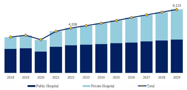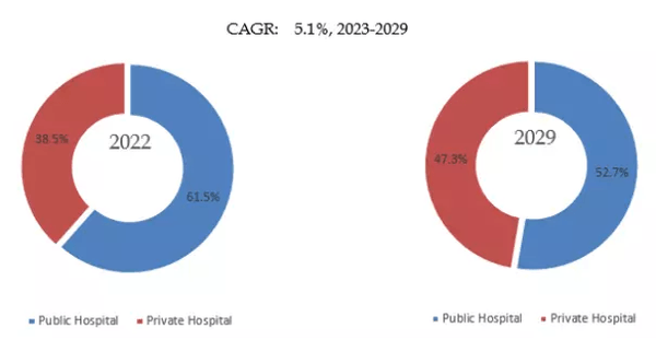 製品の用途別では、公立病院が最大の用途で、2022年には61.5%のシェアを占める。