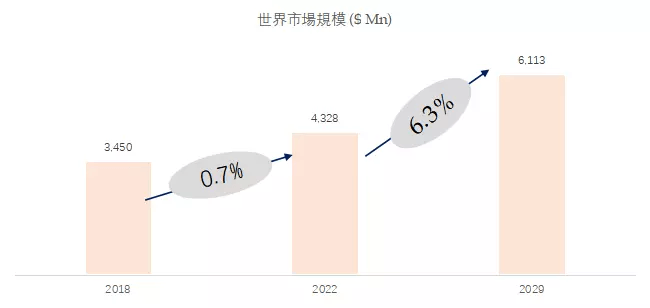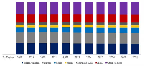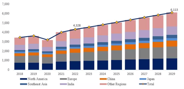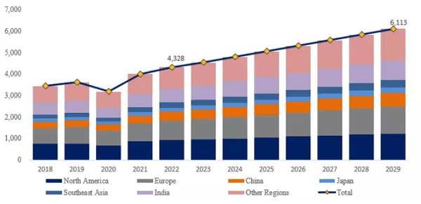 地域別では、北米が市場シェア22%で最大の消費者市場であり、次いで欧州が21%、インドが15%となっている。2023年から2029年までの年平均成長率は約6.5%で、中国が最も急成長すると予想される。