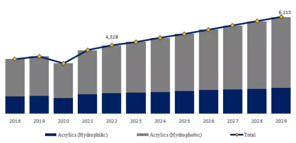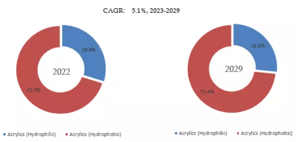 製品タイプ別では、アクリル(疎水性)が最大のセグメントで、2022年の売上ベースで70.2%のシェアを占め、次いでアクリル(親水性)が29.8%を占めている。