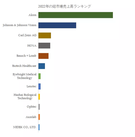 2022年には、世界のアクリル非球面眼内レンズ(IOLs)上位12社が収益ベースで市場シェアの82%を占める。上図は、アクリル非球面眼内レンズ(IOLs)における主要プレイヤーの売上高ランキングを示している。