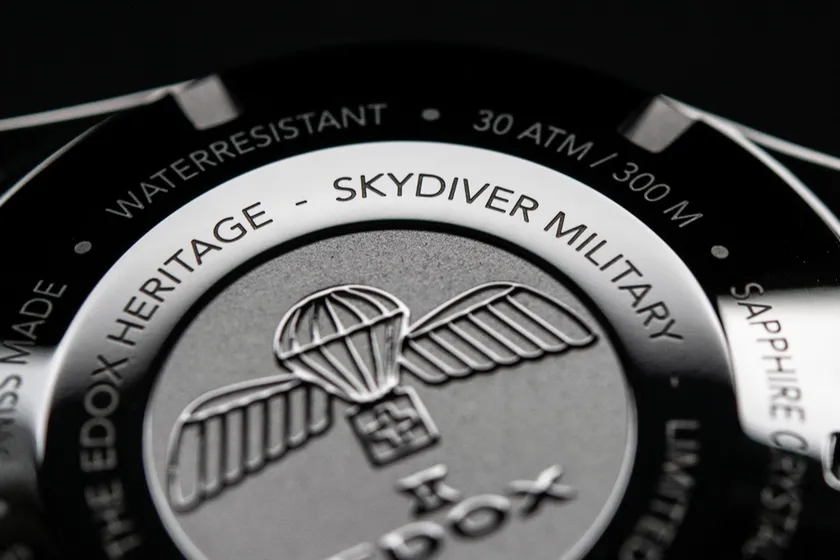 大きさの異なる大小のアプライド式のインデックスと時分針には、ブラックとホワイトのカラーのスーパールミノバを塗布し、暗闇での視認性を確保しました。3時位置には実用的なデイト表示を設けています。表示ウィンドウにホワイトの縁取りを施し、存在感を高めるとともにデザインのバランスを整えました。ケースバックには、エドックスのロゴとパラシュート部隊をイメージしたモチーフの刻印が、現代版のアレンジとして施されています。