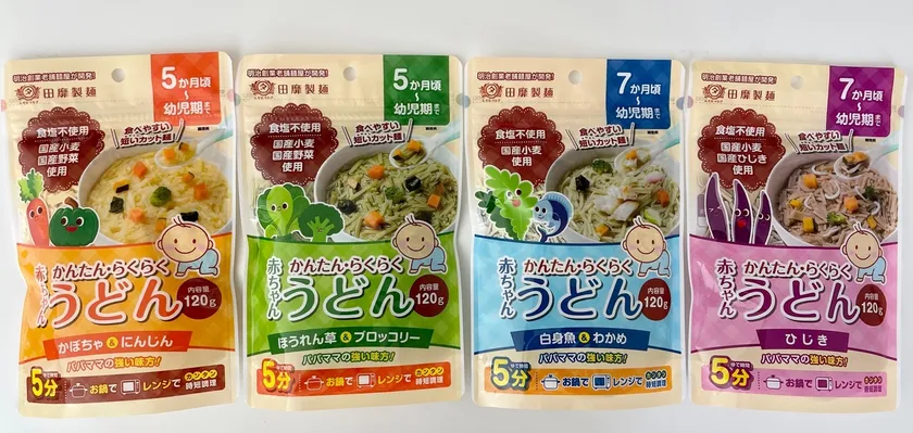 老舗乾麺メーカー「田靡製麺」が、生後5か月から食べられる 「赤ちゃんうどん120g」4種を9月15日(木)に発売!