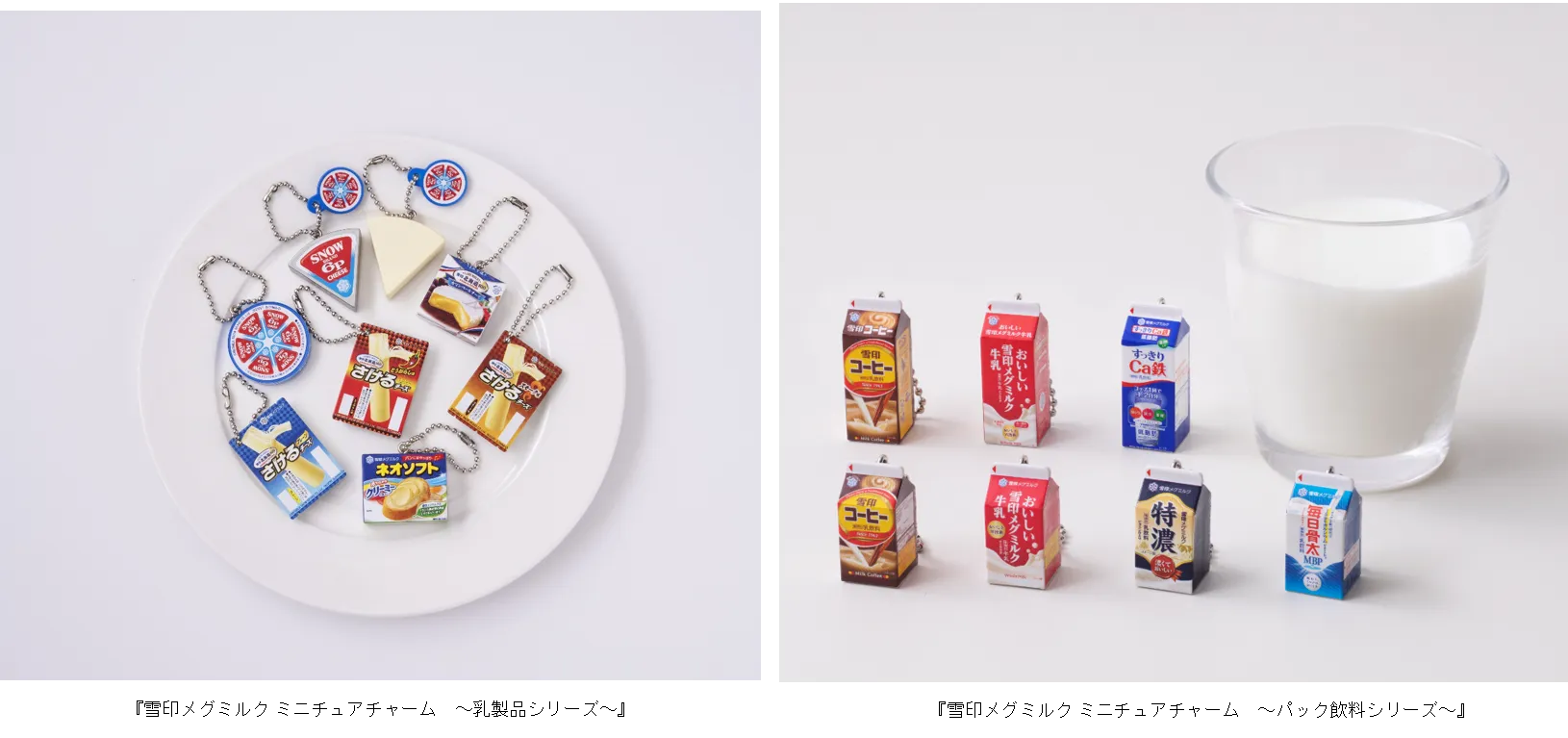 『雪印メグミルク ミニチュアチャーム~乳製品シリーズ~』は、「6Pチーズ」や「雪印北海道100 さけるチーズ」など全8種類、『雪印メグミルク ミニチュアチャーム~パック飲料シリーズ~』は、「雪印コーヒー」や「おいしい雪印メグミルク牛乳」など全7種類を販売します。