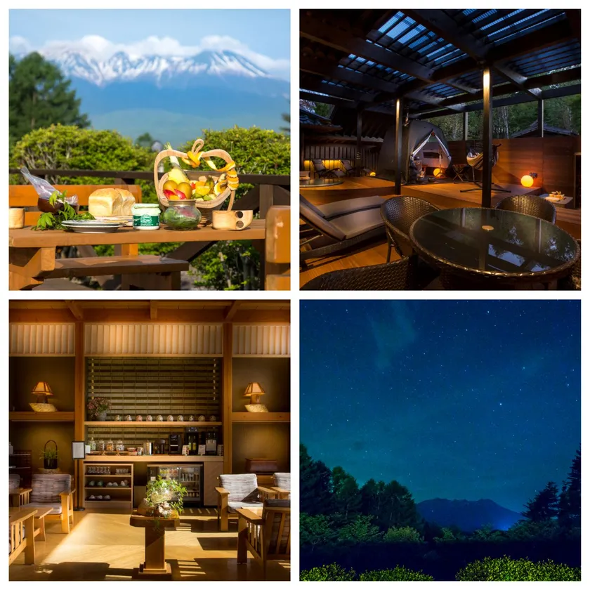 開田高原の四季折々の風景と木曽御嶽山を一望できる宿「つたや季の宿 風里(かざり)」では、昨年10月にプライベートテントサウナ付きの部屋をオープンし、昼は雄大な木曽御嶽山、夜には満点の星空を眺めながら、完全プライベートな空間でテントサウナと露天風呂、源泉水風呂をお楽しみいただけるラグジュアリーな客室が人気です。開放感あふれる高原の一軒宿の絶景と美味しい食事にリピーターが絶えません。