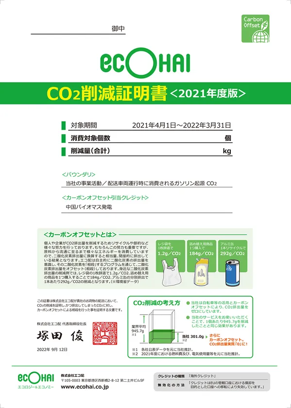 自転車を使った格安宅配便で宅配業界のLCCを目指す株式会社エコ配(本社:東京都港区、代表取締役社長:塚田 俊、以下 当社)は、2021年度における年間CO2排出量を発表するとともに、企業物流における環境負荷を「見える化」することを目的に、『CO2削減証明書<2021年度版>』をエコ配ホームページ上にて2022年9月12日より順次発行いたします。