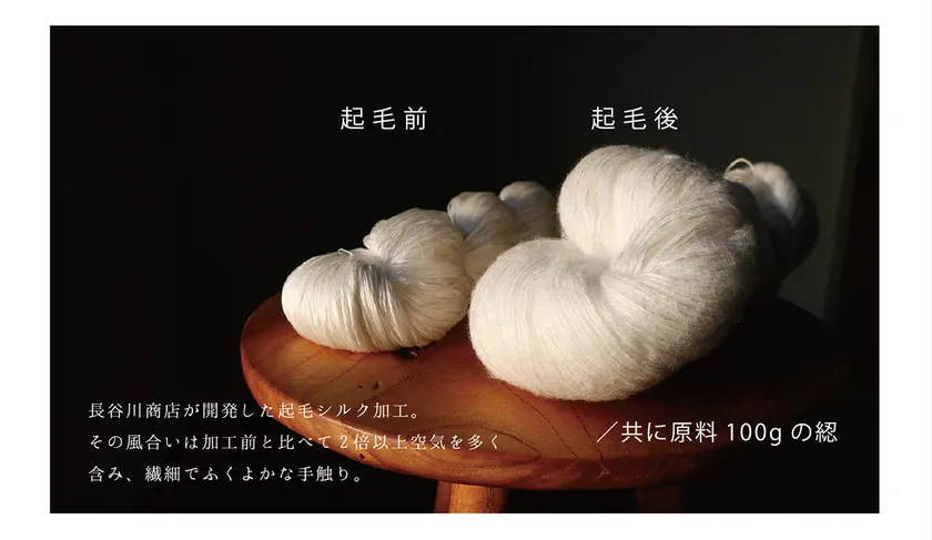 一般的なシルクのイメージは「つるつる、キラキラ」で、触るとひんやりするイメージですが、「KOHARU」の製品は、その概念が覆されるプレミアムで柔らかな肌触りを持ちます。糸自身を起毛することで、編立てた時に、空気が入りふわふわになり、柔らかであたたかな奇跡のシルクが完成します。