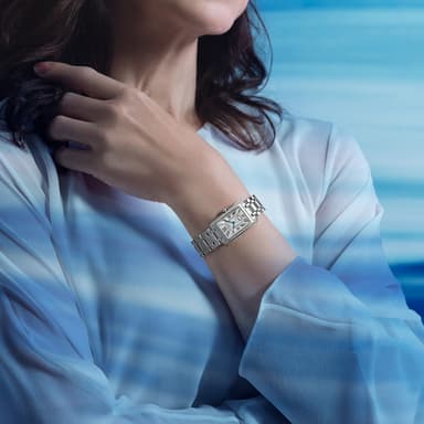 1925年のアールデコ時代のモデルをモチーフとしたオーセンティックなデザインに、46個のトップ ウェッセルトンIF-VVSダイヤモンド(0.386カラット)がベゼルに上品に瞬き、腕元を華やかに彩ります。クラシカルなローマンインデックスやスマートなレクタンギュラー(長方形)のケース、フランケ加工が施された文字盤やブルースティールの針など、洗練されたデザインの中に、ウォッチメイキングの伝統が息づいています。
