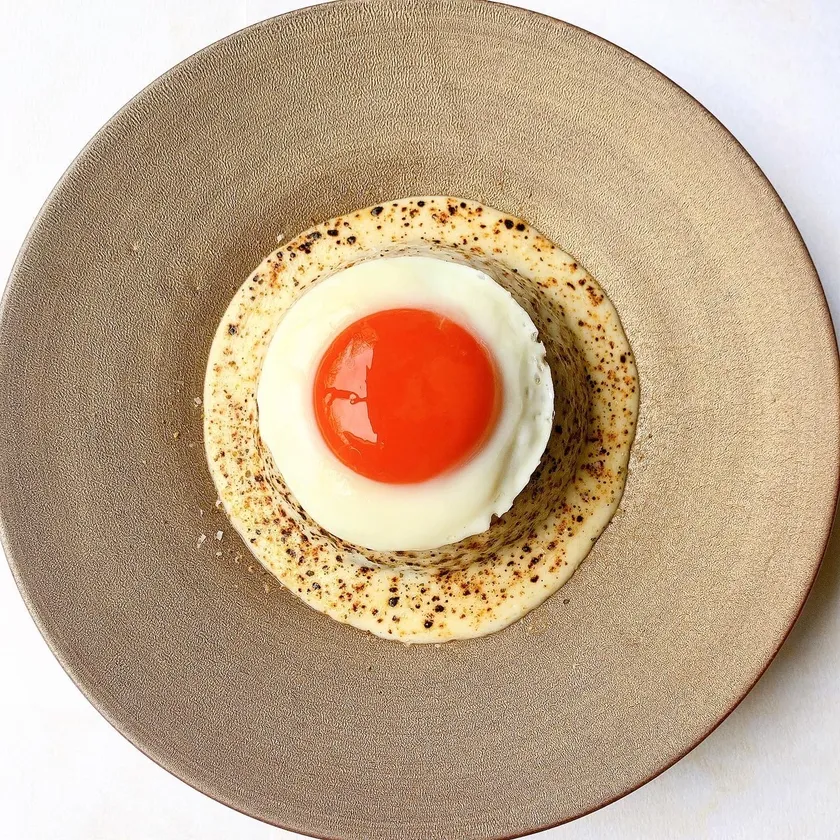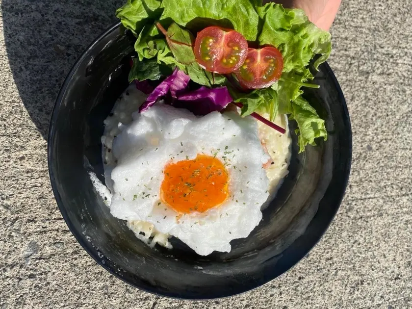 ●特徴:新食感のメレンゲめだま焼きのふわふわ白身と濃厚な黄身をカルボリゾットに絡めて食べるとカルボナーラとして楽しめる
