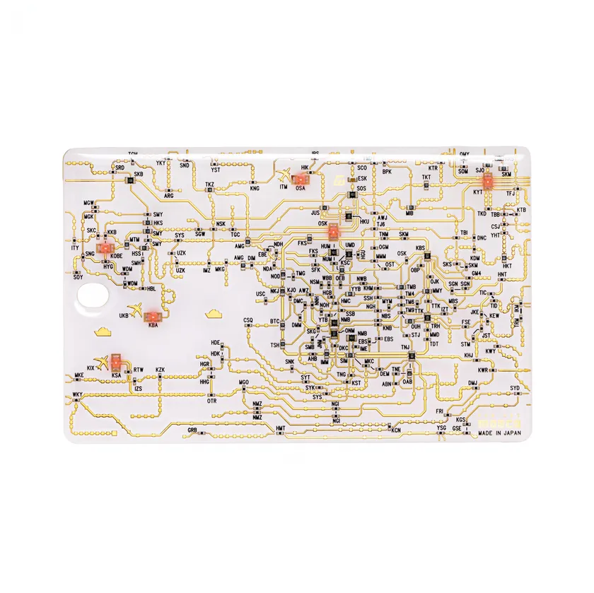 基板の配線パターン(金メッキ)で関西近郊の路線図をデザインしました。改札のタッチやタッチ式セキュリティの使用時に大阪・京都・神戸駅と関西空港・伊丹空港・神戸空港に実装したLEDが電波で光ります。