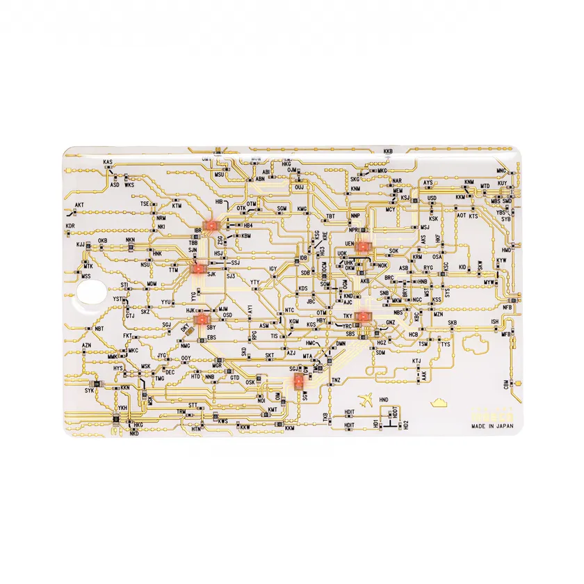 基板の配線パターン(金メッキ)で東京近郊の路線図をデザインしました。改札のタッチやタッチ式セキュリティの使用時に東京・上野・池袋・新宿・渋谷・品川駅に実装したLEDが電波で光ります。