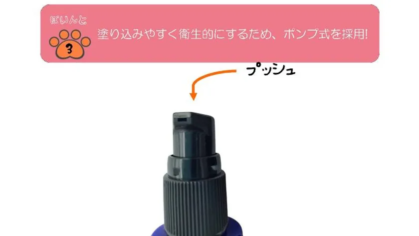 飼い主さんが使いやすく、外気に触れにくく、細菌の侵入を極力避けるためポンプ式を採用しました。