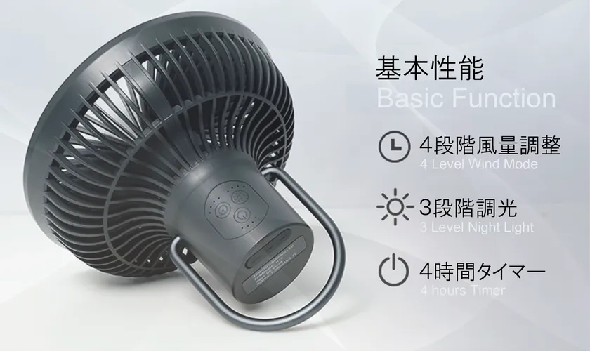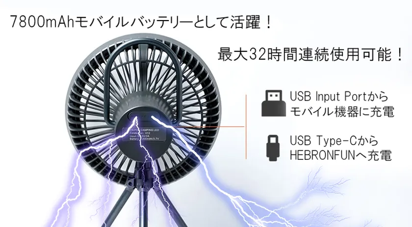そこで、開発したのが「HEBRONFUN」。超軽量だから持ち運びは自在。最大32時間稼働する充電式コードレス。本体からモバイル機器へ充電可能。さらに照明機能や、ハンガー付で、どこでも吊り下げOK。
