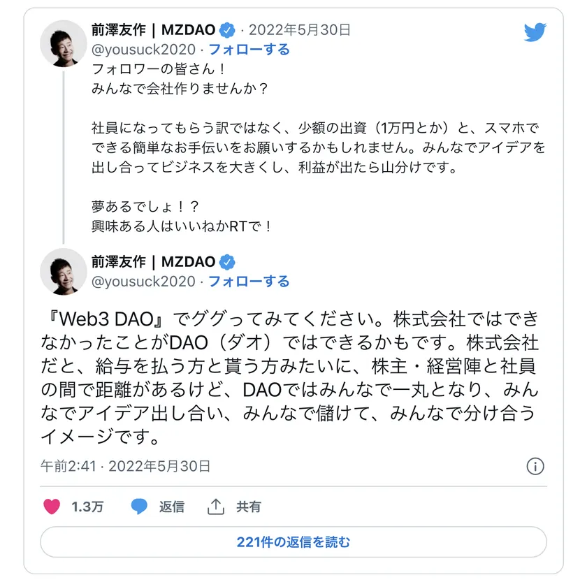 2022年5月30日、ZOZOの代表取締役社長である前澤友作氏は、分散型ネットワークであるWeb3.0をベースにしたDAO(Autonomous Decentralized Organization:分散型自律組織)の立ち上げをツイッター上で呼びかけたところ、わずか1か月の間に、22万人以上の人々がメンバーに加入したいと申請を行いました。