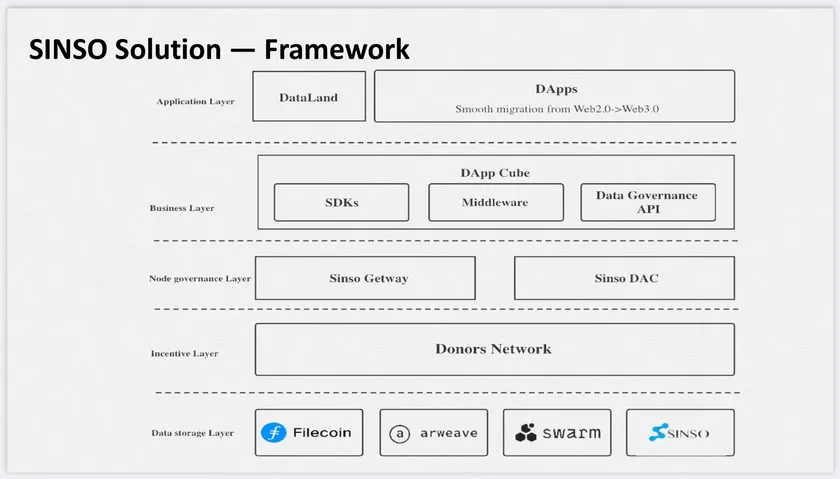 業界には、「NO Layer2, NO Web3.0(レイヤー2無しにWeb3.0は無い)」という言い回しがあります。SINSOもレイヤー2の1つのプロジェクトですが、イーサリアムのレイヤー2プロジェクトとは異なります。中間層インフラストラクチャーとして、SINSOは、第3層のDAPPとベース層の分散データストレージネットワーク間の高効率かつ低コストでのインタラクティブなアクセスをサポートしています。レイヤー2テクノロジーは、ベースフレームワークの上に構築されているとみなすことができ、レイヤー1基盤の多くの制限を修正する事ができます。堅実な基盤と正確なフレームワークがある事で、イノベーターは迅速かつ高い効率を持ってWeb 3.0の未来を構築できます。