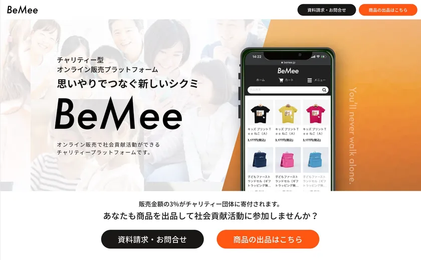 「BeMee」は、販売金額の3%をご購入者様のご希望に沿ったチャリティー団体に寄付させていただくことで、持続可能な支援活動を実現する「参加型チャリティーエコシステム」です。