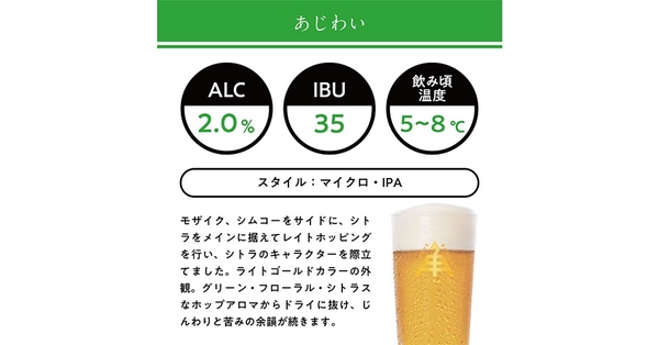 2%のビールですが、6.5%のIPAと同じ量のモルトを使用しています。テクスチャにアルコール分の少なさゆえの水っぽさこそあれど、モルト・ホップのキャラクターはしっかりと感じられるローアルコールビールに仕上がりました。