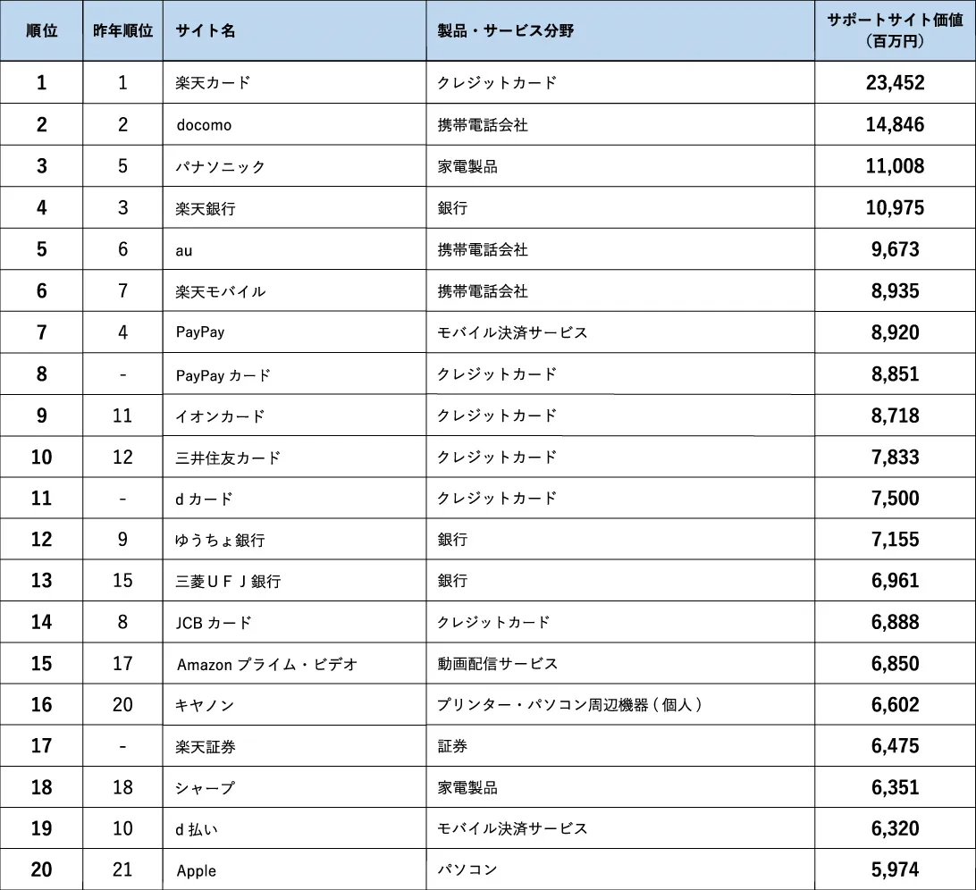 ランキング1位は3年連続で楽天カード(クレジットカード)です。楽天カードは2021年のカード発行増加枚数355万枚、2022年1月にカード発行枚数2500万枚突破するなど堅調を維持しており、サポートサイト価値の構成要素であるサイト利用率も2位以下に圧倒的な差を付け1位となりました。