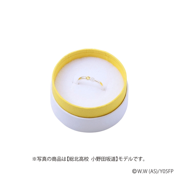 V字フォルムのリングにタイヤと校章モチーフ、ジャージのラインを取り込み、イメージカラーストーンをセット。