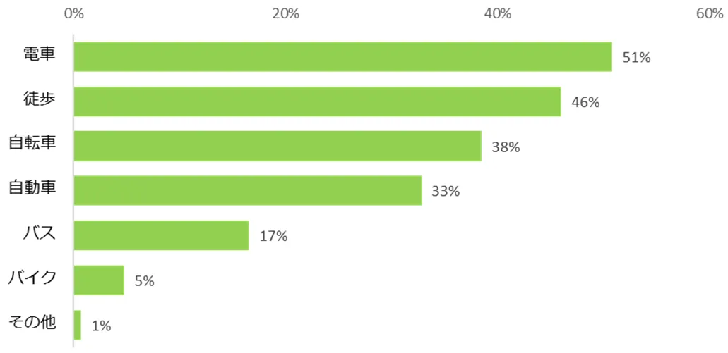 「希望する自宅からの通勤時間はどれくらいですか?」と伺うと、半数が「16~30分」(52%)と回答しました。希望する交通手段もあわせて質問すると、トップ3は「電車」(51%)、「徒歩」(46%)、「自転車」(38%)でした。希望の通勤時間を選んだ具体的な理由もあわせて紹介します。