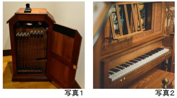 エジソンが発明した動く映像を見るための機械「キネトスコープ」(復元、写真1)や、無声映画にBGMや効果音をつけるための自動演奏ピアノ「ワーリッツァー・スタイル“O”フォトプレーヤー」(1920年頃、アメリカ製、写真2)をご紹介します。