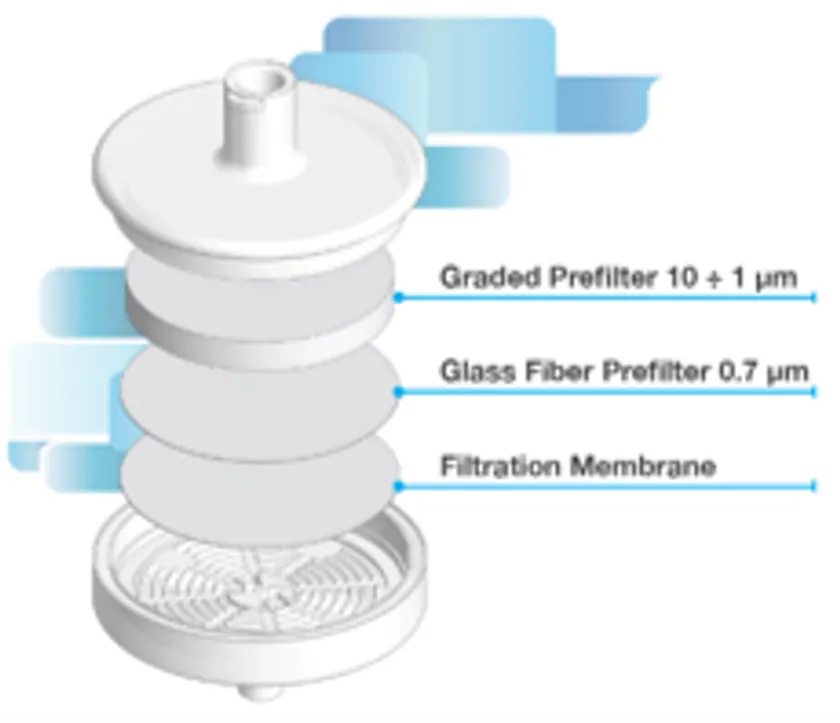 従来のシリンジフィルターでは粘度の高いサンプルや、夾雑物が多いサンプルでは目詰まりを起こしやすいサンプルのろ過容量を、プレフィルターを多層組み込むことで3~5倍に増加させ、各種サンプルの前処理を容易にしました。