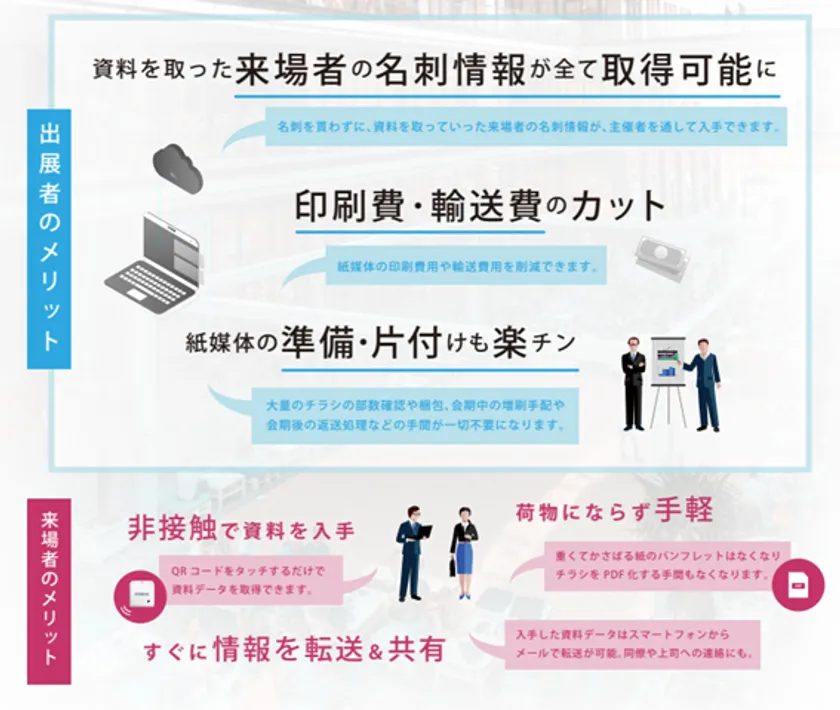 さらに、ペーパーレス化によるコストダウン、DX化による業務効率化を同時に図ることができるソリューションといえ、環境に配慮した展示会やイベントの開催に寄与できるなど、SDGsの実現目標にも貢献できるサービスといえます。