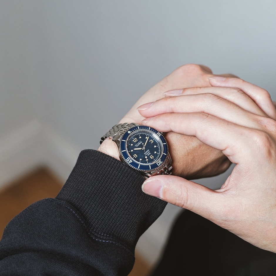 ネイビーモデルは、深海を思わせる落ち着いた色調の中に、メテオライト特有の結晶模様が静かに浮かび上がる仕上がり。ヴィンテージダイバーズの重厚感と、宇宙素材ならではのロマンが融合した、知的で洗練された一本です。