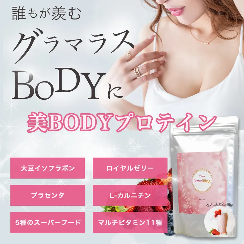 バストアップ専門エステ『JewelRing(ジュエルリング)』を展開する株式会社JEWEL RING(本社:東京都港区、代表取締役:木村 恭子)は、バストケアできるプロテイン「美BODYプロテイン」を、楽天市場で販売開始しました。