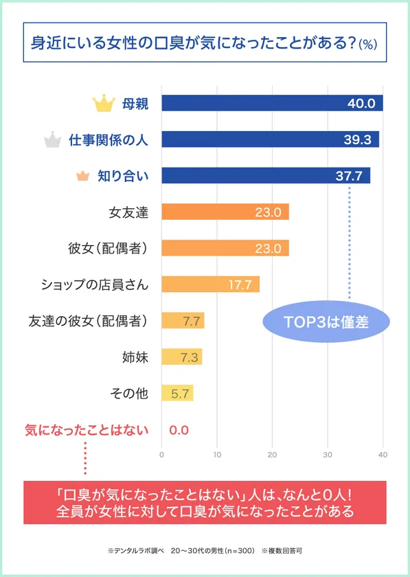 20~30代の男性300人に「身近にいる女性の口臭が気になったことがあるか」と聞いたところ、「気になったことはない」と回答した人は0人という結果に。なんと、全員が身近にいる女性の口臭が気になったことがあることが判明しました。