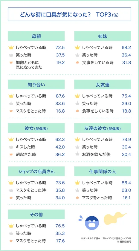 次に、「どんな時に口臭が気になったのか」を聞いてみると、相手が誰であれ、共通して1位だったのはダントツで「しゃべっている時」。やはり至近距離で会話をしている時に、口臭に気づく男性がもっとも多いことがわかりました。