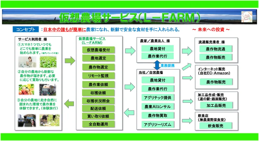 『仮想農場サービス(L-FARM)』は食料自給率や農業人口の低下といった社会課題を解決する為の有効な対策であると確信しています。このサービスを通じて、皆さまが手軽に農業の応援が出来て、子供たちに明るい未来を残すきっかけを創ることができると考えています。