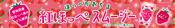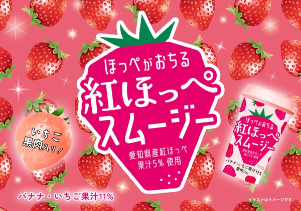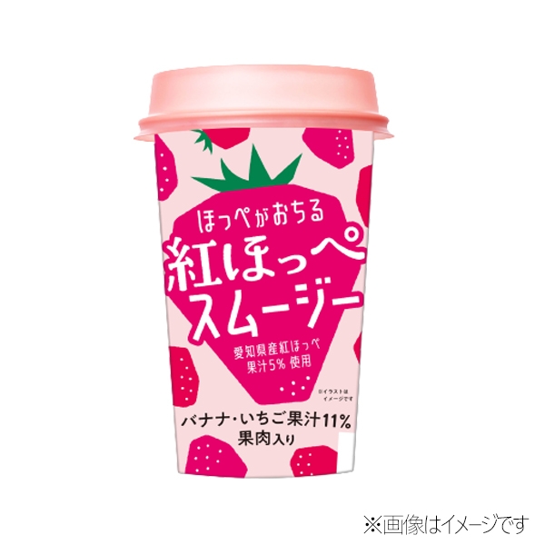 当カンパニーは、本年2月、ミルクに甘酸っぱい愛知県産「紅ほっぺ」の果汁とごろごろ果肉をブレンドしたカップ飲料「とろとろ紅ほっぺ」を販売しました。今回、その第2弾として、愛知県産「紅ほっぺ」果汁(5%)を使用した「ほっぺがおちる 紅ほっぺスムージー」を発売します。