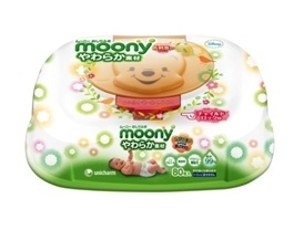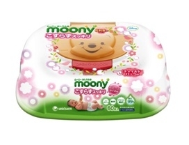 『ムーニーおしりふき』は1989年の発売以来、改良を重ね、近年はディズニーキャラクターのかわいいデザインと、「チャイルドロック」や「ワンタッチオープン」といった、市場に先駆けた独自の機能を搭載したベビー用おしりふきとして、長い間お客様よりご愛用頂いています。