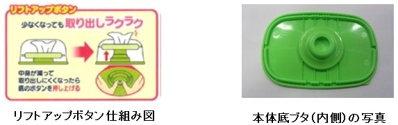 また、本体容器の中身が減るとシートが取り出しにくいといった不満のお声に答えるべく、ムーニーオリジナルの「リフトアップ機能(※)」を本体容器の底ブタに搭載いたしました。中身が減っても、シートが取り出しにくくなったら、底ブタのリフトアップボタンを押し上げることで、最後までストレス無くシートを取り出すことができます。