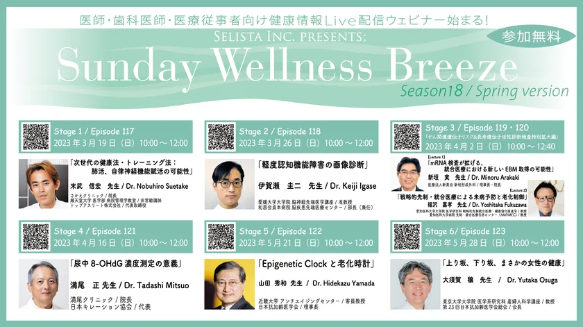 《医師・歯科医師・薬剤師・医療従事者限定 無料オンラインZoomセミナー》 抗加齢・予防医療の最新情報が学べる! 『Sunday Wellness Breeze Season 18』 全6回 7講演開催決定/セリスタ株式会社