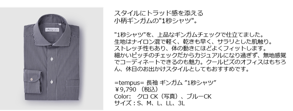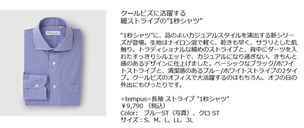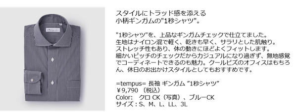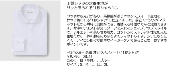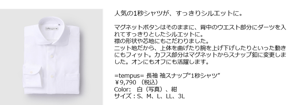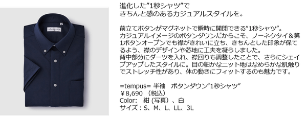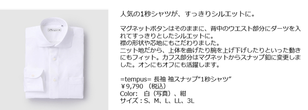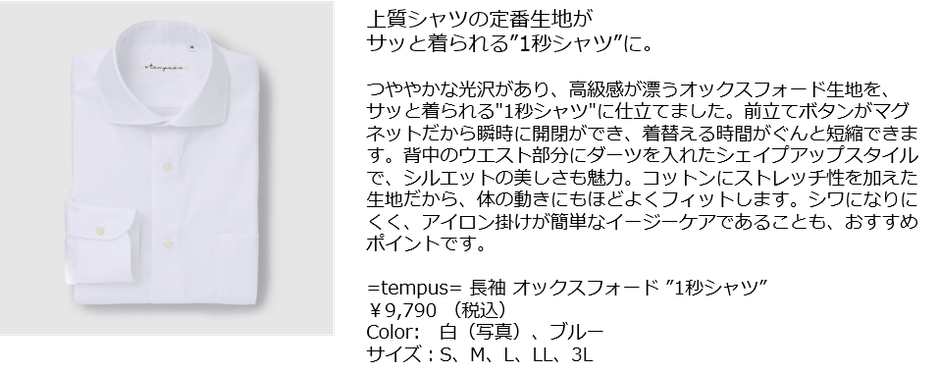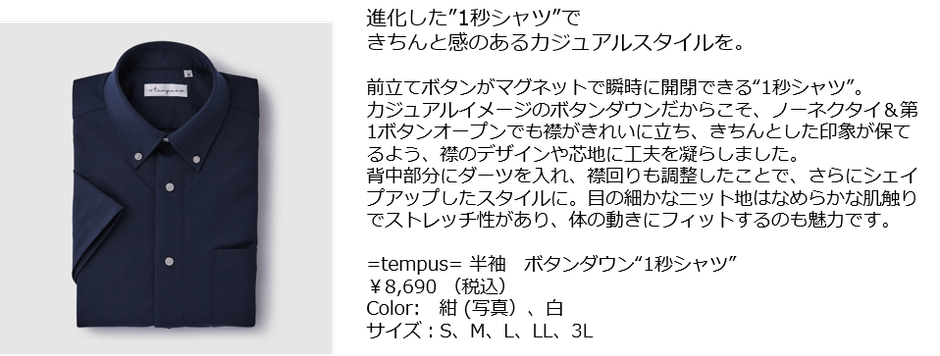 1秒でボタンが留まる!と大好評の究極の時短シャツ『=tempus= イコールテンプス』から 新商品・新色の登場。