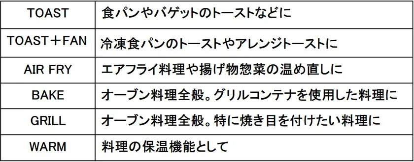 トーストのおいしさを追求する日本のユーザーに合わせ冷凍食パンが美味しく焼けるファンありのトーストモードと、オーブン料理の焼き目付けに最適なグリルモードを追加しました。