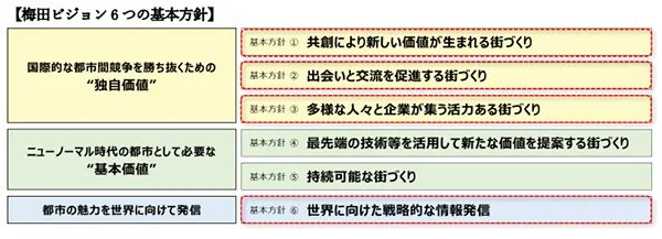 本取組みは、梅田ビジョンに掲げる基本方針1・2・3・6の街づくりを目指しています。