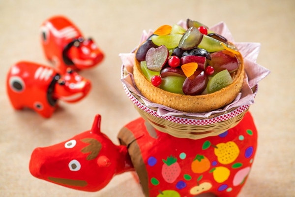 1品目に、地域の食材を掛け合わせた5種のミニャルディーズ(一口サイズの菓子)のセットが提供されます。酒粕と梨を合わせたプチシューや、蕎麦を使ったチョコレート、田楽味噌を使ったフィナンシェなど、地域の味を洋菓子としてアレンジしています。器は、会津三縁起のひとつとして地域に親しまれている「かざぐるま」の羽をイメージしたものです。2品目はメインとして「3種のぶどうのタルト」が提供されます。たっぷりと盛り付けられた3種類のぶどうの下に隠れている干し柿の濃厚な甘さがアクセントになっています。器は赤べこがタルトを背負っているように見えるフォトジェニックな形で、見た目も楽しい一品です。